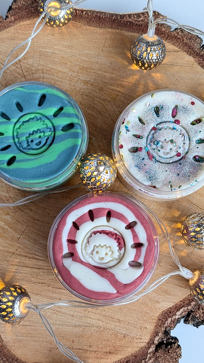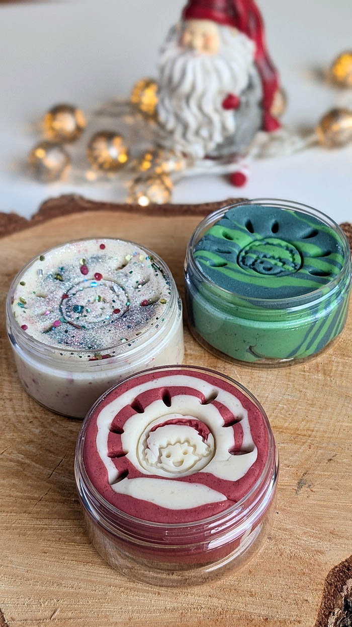 Set sadrži tri teglice mekane, mirisne i ručno rađene mase u posebnim blagdanskim bojama, obogaćenima Bio Glitterom.